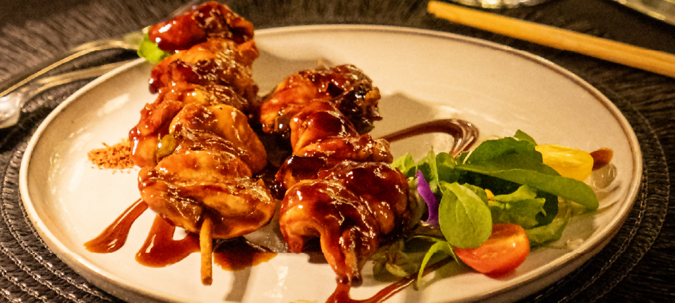 Le siguió un clásico yakitori de pollo y espárragos con una exquisita salsa agridulce, maridado con el elegante Studio Rose de Miraval The Art of Rose.